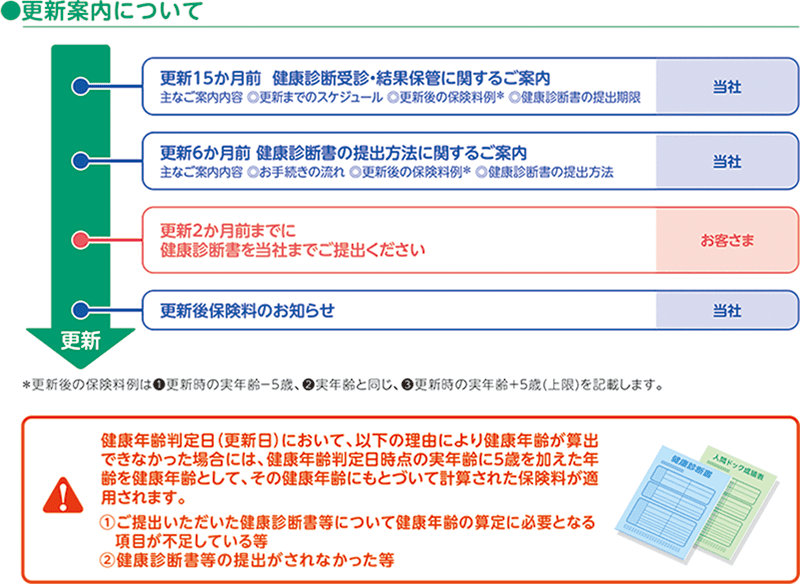 - 通常、同一の保障内容で更新される場合であっても、更新により保険料は変動します(健康診断結果が良い場合であっても、実年齢が上がることにより、健康年齢が上がり、更新後の保険料は更新前の保険料より高くなることがあります)。