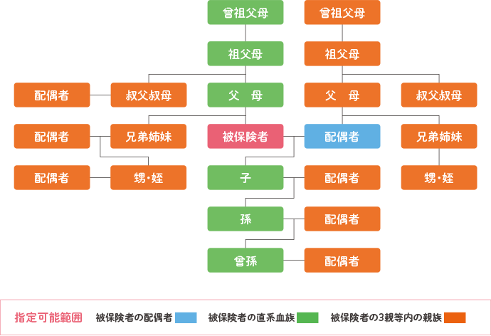 契約者が被保険者の同意を得て、以下の範囲からご家族1人を指定できます。