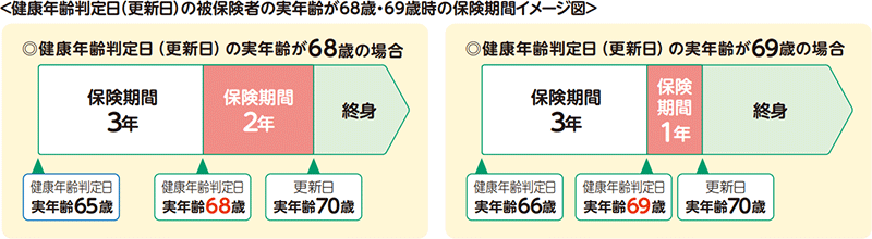 - 健康年齢判定日(更新日)における被保険者の実年齢が68歳の場合は更新後の保険期間は2年、69歳の場合は更新後の保険期間は1年です。